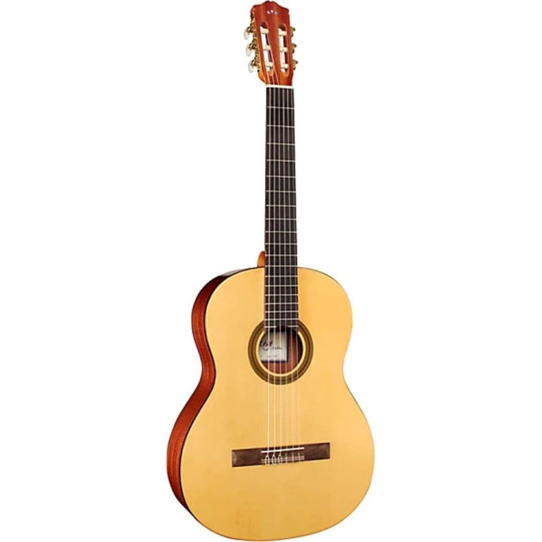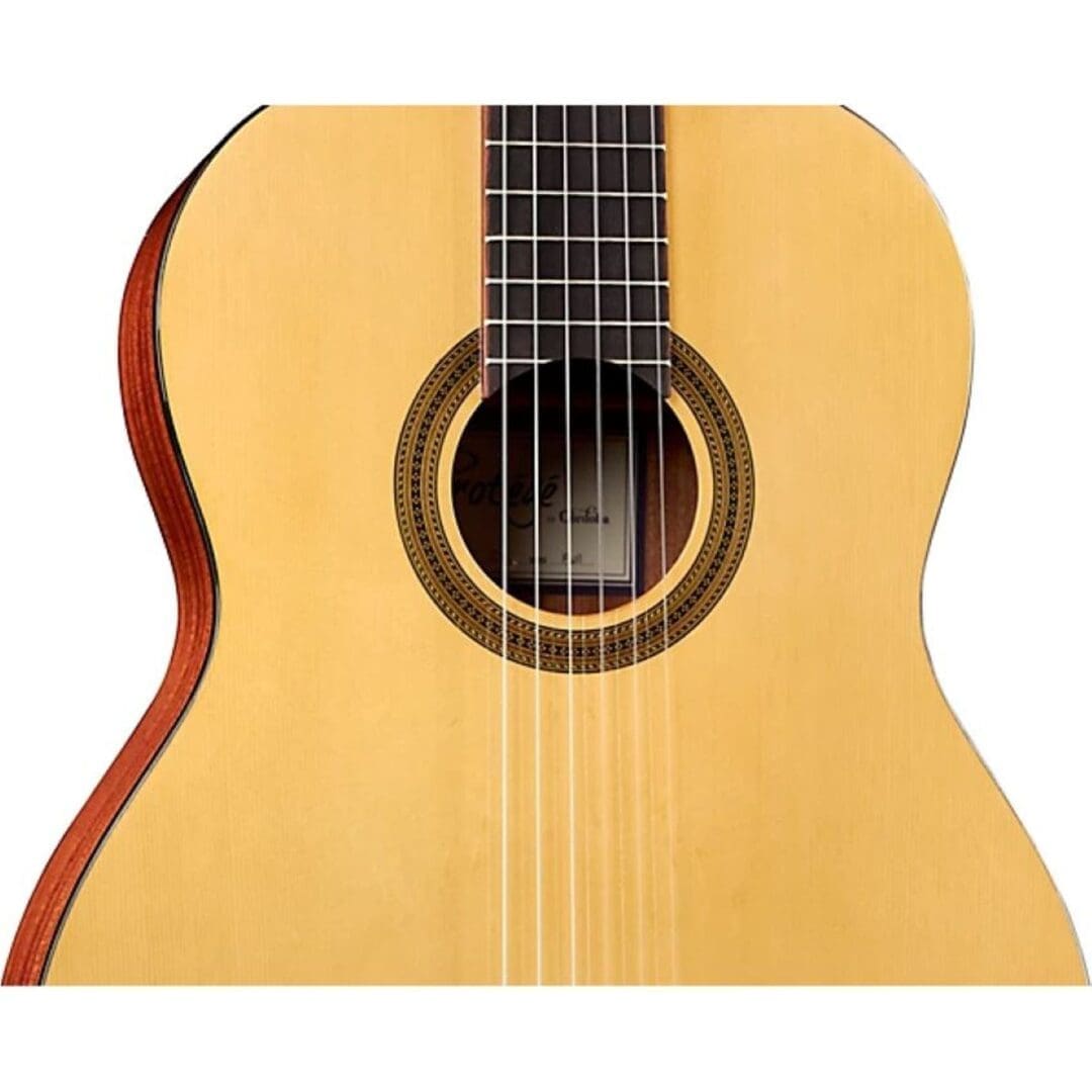 The C1 is a full-size nylon string Spanish-style guitar. It belongs to the Protege by Cordoba line, a series of high-quality instruments created to provide aspiring young guitarists with a comfortable first guitar that’s easy to learn on and play. Offered in full, half, three-quarter, and one-quarter sizes, the Proteg by Cordoba models feature the classic combination spruce tops with mahogany back and sides, rosewood bridges, rosewood fingerboards, a Hauser-style wood-inlaid mosaic rosette, nickel tuning machines, premium Savarez strings, and a high-gloss polyurethane finish. All Protege by Cordoba guitars also include a two-way truss rod and a Cordoba gig bag.