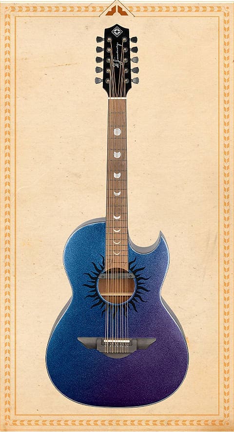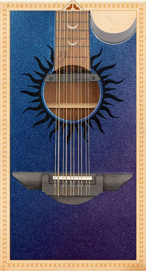 The H. Jimenez LBQ1GXE-AB (Aurora Borealis) Bajo Quinto is part of the Colección de Galaxia inspired by elements in the galaxy. This stunning color changing bajo has a glossy Solid Spruce top painted with sparkle color changing paint that mesmerizingly ungulates purple to blue with player movement, it has Mahogany back and sides, and a special bajo-voiced active Fishman® RareEarth pickup with a volume control. Other features include an adjustable truss rod, a solid headstock with black individual tuning machines, Moon phase inlay, Sunfire rosette, black multi-ply ABS binding, bone nut and saddle, D’Addario® J-85 Bronze strings, a hardshell case and a limited lifetime warranty.