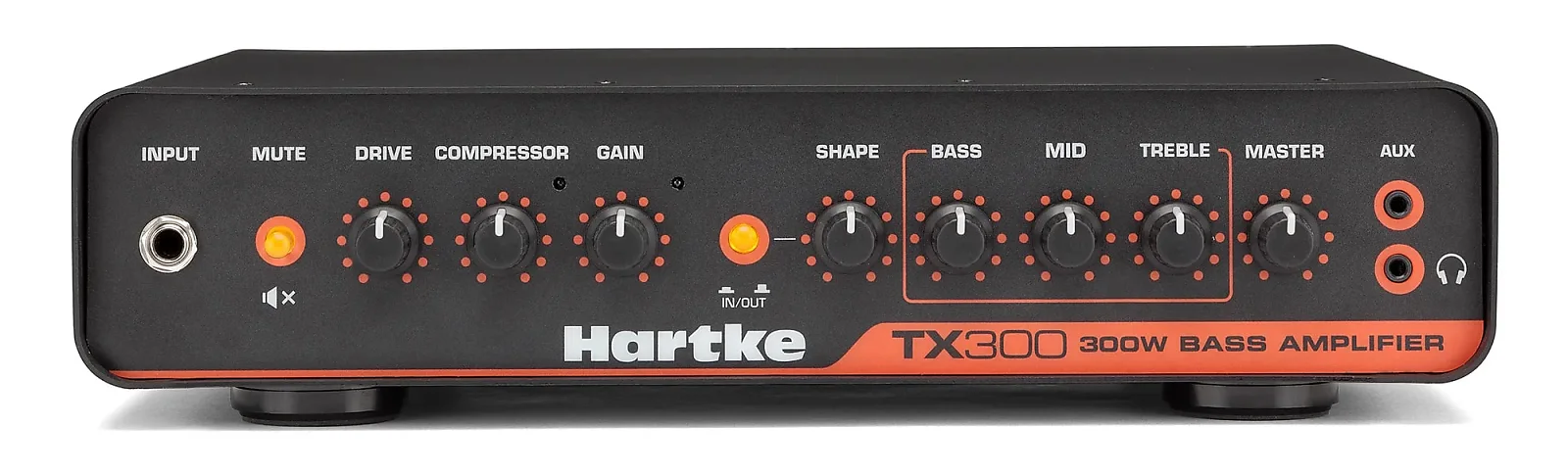 The TX300 preamp features an active 3-band EQ with Hartke’s Shape circuitry for tremendous control over tone. The Drive control allows users to add subtle warmth to their tone or crank it up to full fuzz. The onboard compressor can be dialed up to even out note volume, add punch, and protect the speaker cabinet.