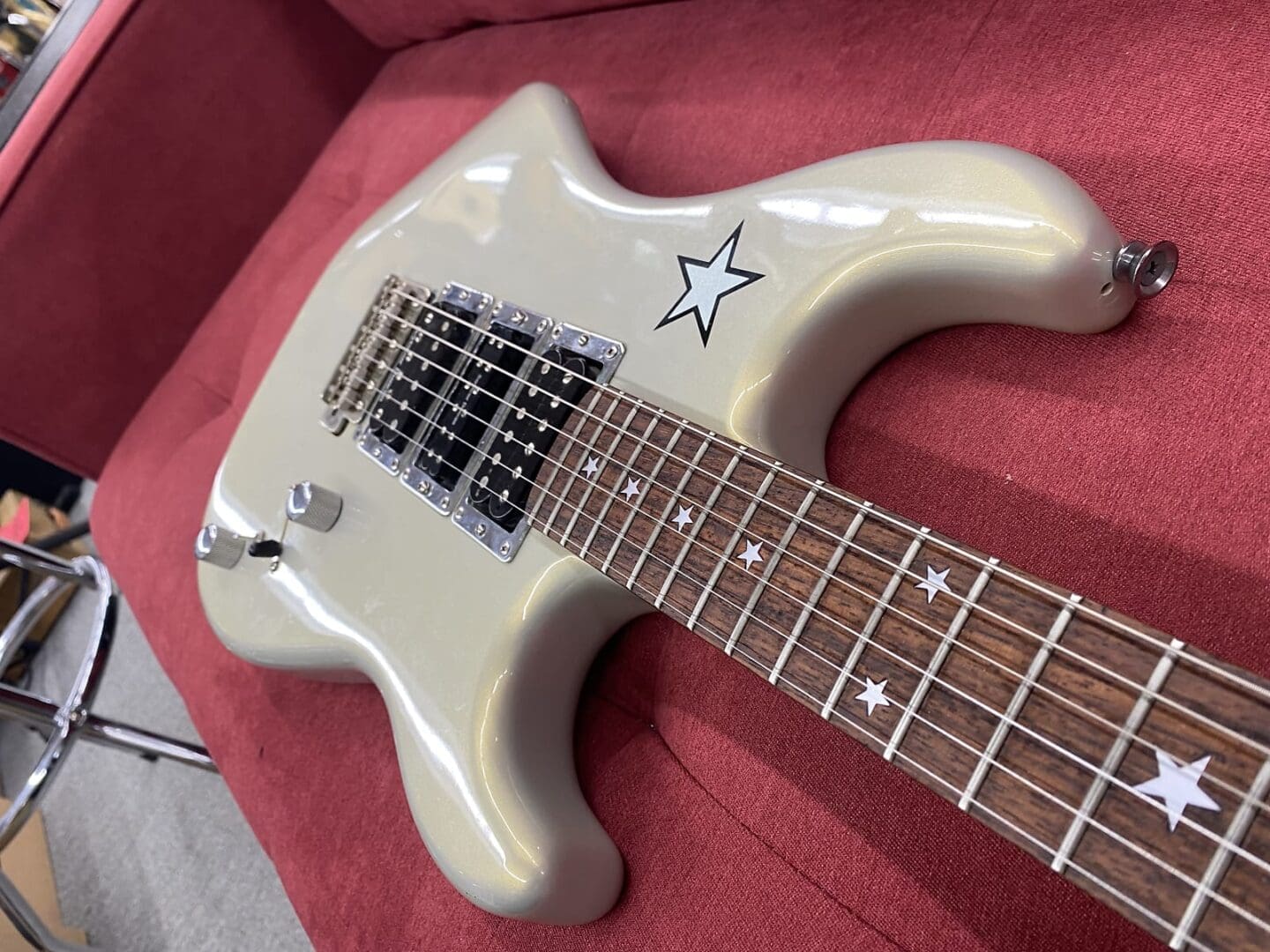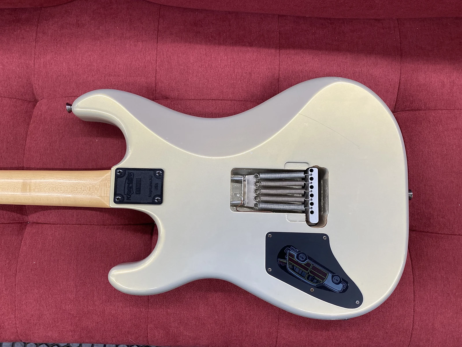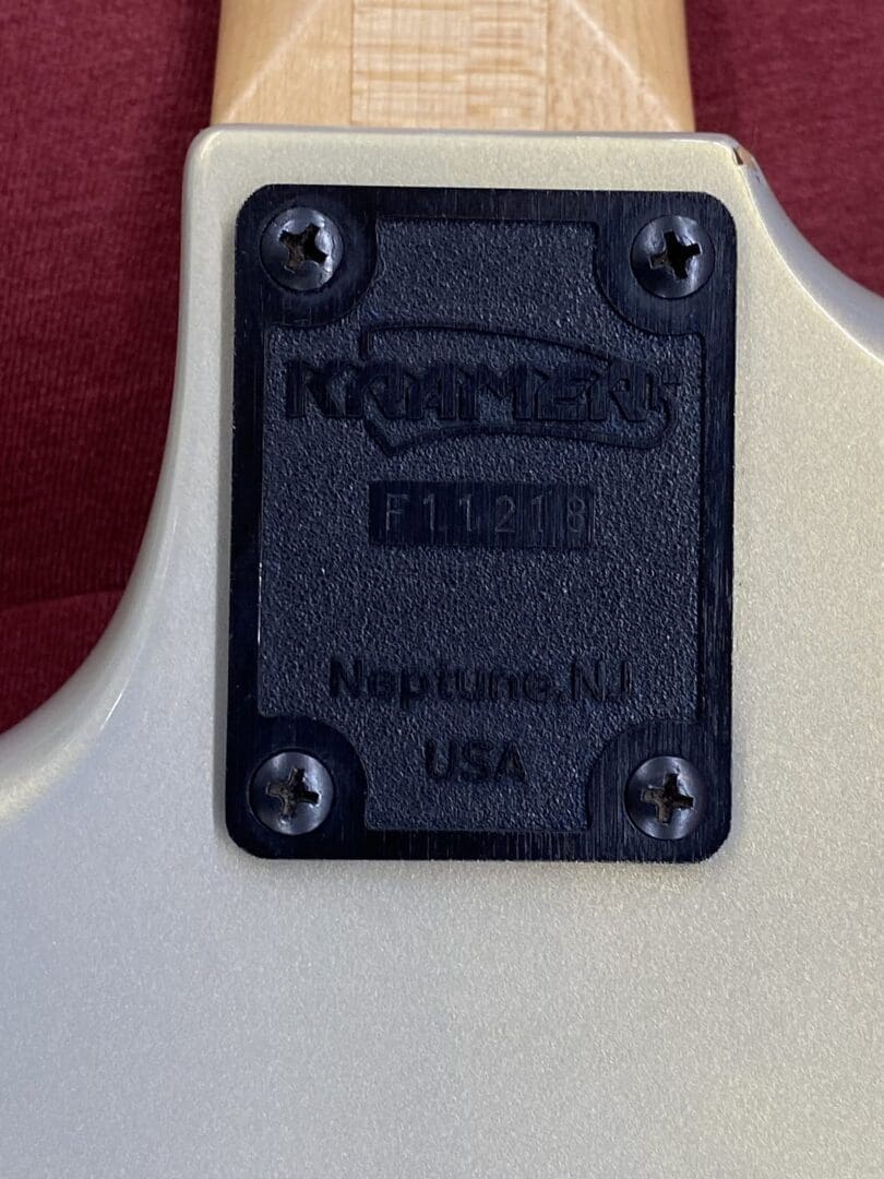 Here is a guitar that was put together using original Kramer USA parts that we, Victor Litz Music Center, bought directly from the Kramer factory in the early 1980’s when they were going out of business. Guitar plays great and is set up with DR 10’s. There is some buckle rash on the back of the body (see photos). The neck is a 22 fret USA Kramer Jersey Star neck (really an ESP neck). The lock nut has been removed and the screw holes have been plugged. The body is a Kramer Jersey Star body that has been moded and routed slightly to fit a strat style tremolo. Original holes for trem plugged. Pickups are old Seymour Duncan’s. There’s a Pearly Gates in the bridge position, Duncan 1nc in the middle, and a 59NL in the neck position. The electronics feature 1 master volume, 1 master tone, 5-way switch, and a coil tap for the bridge pickup. Tuners are Schaller’s. Guitar weighs 8 lbs 2 oz. OFFERS WELCOME!!!