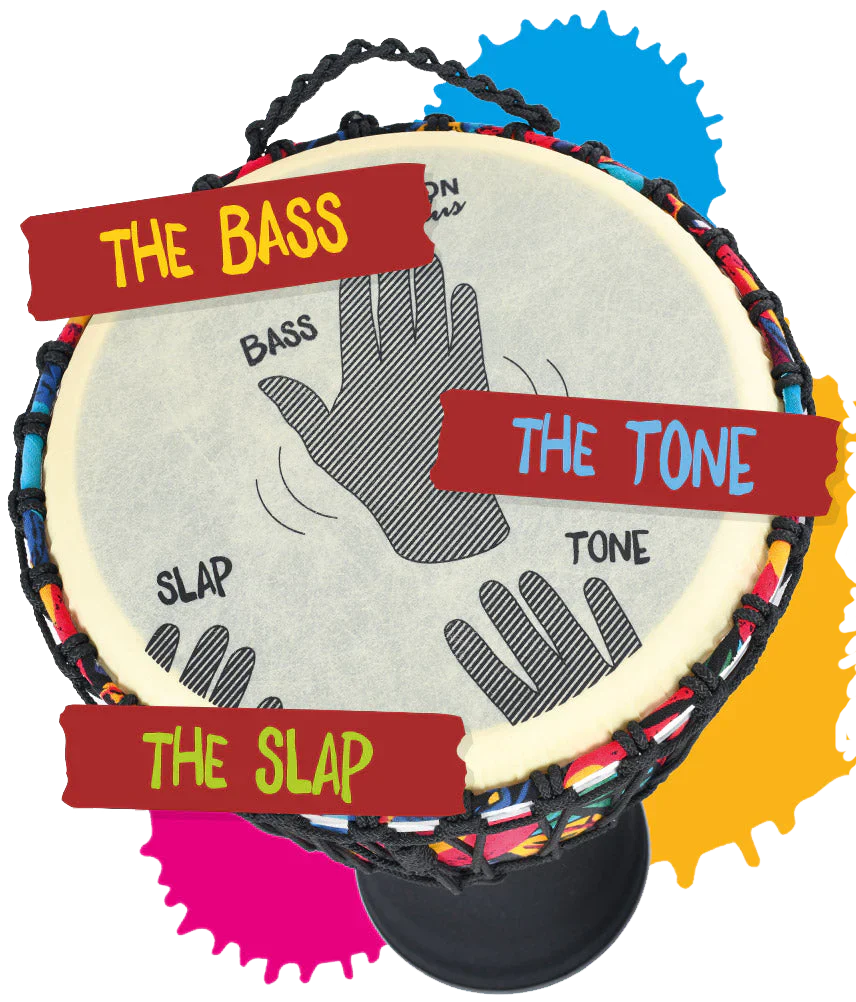 All SLAP brand drums include a tactile playing surface providing an authentic feel and includes the innovative “how-to-play” graphics printed directly on the drumhead.  These show where the hands should strike to obtain a variety of sounds, making it effortless to create booming bass, crisp slaps, and singing open tones.  As one teacher put it “the graphics are a godsend when teaching the different sounds and tones of hand percussion.”